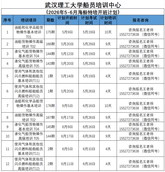 武汉理工大学船员培训中心2026年5-6月份海船特殊培训开班计划