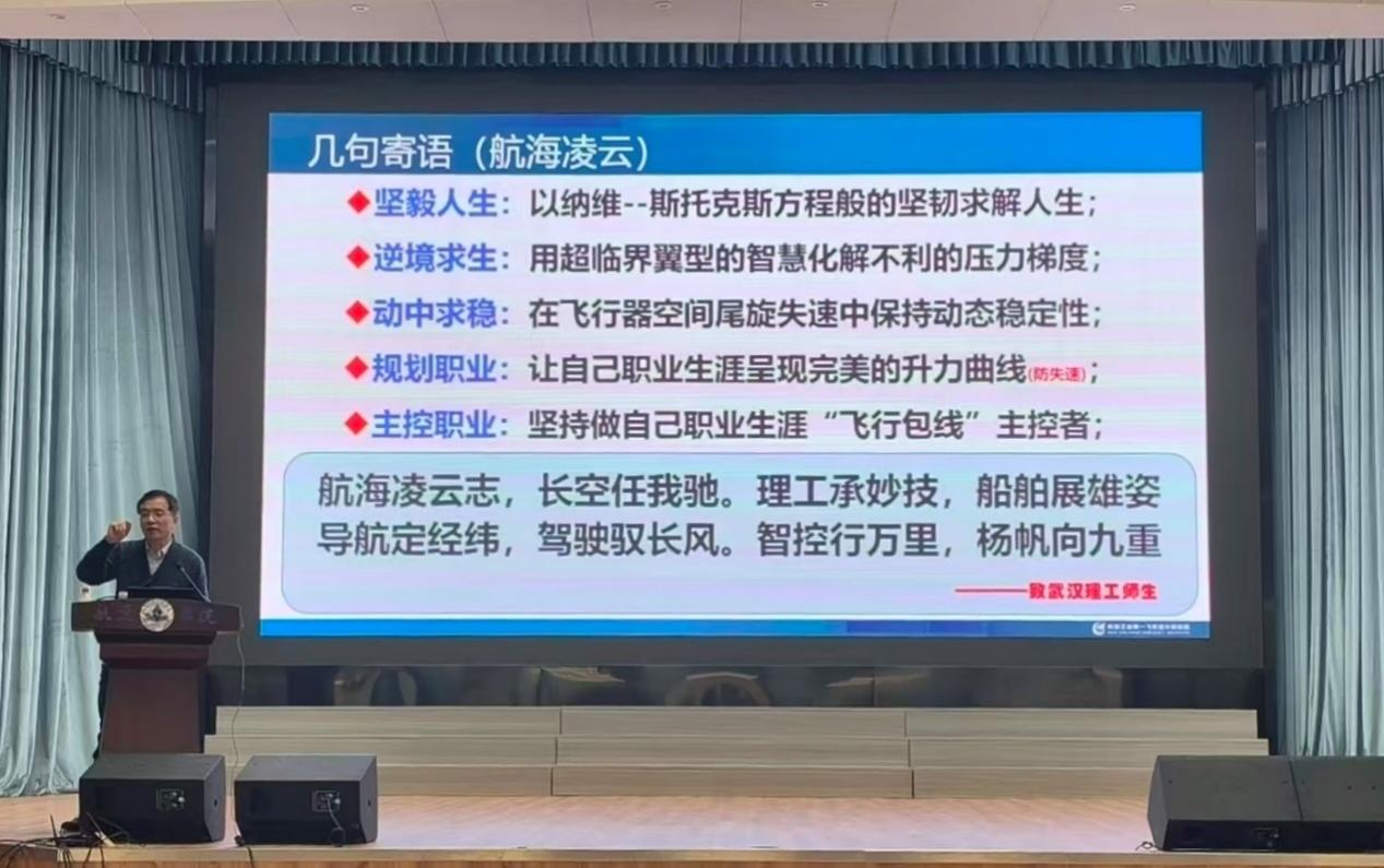 在学术报告环节,艾俊强教授聚焦变体飞机与智能航空,从仿生科学视角解读航空科技创新趋势,让航运学子深刻感受到航空与航海在技术创新、国家战略中的共通价值。报告最后,艾俊强研究员还为航运学子送上专属寄语,以航空、航海专业知识为喻写下励志箴言,表达对青年学子的殷切期盼。他强调,“弱国无外交,强国方有尊严”,航空与航海虽领域不同,但守护国家主权、推动科技进步的使命一脉相承。